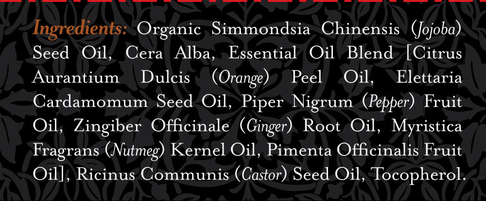 Organic Simmondsia Chinensis (Jojoba) Seed Oil, Cera Alba, Essential Oil Blend [Citrus Aurantium Dulcis (Orange) Peel Oil, Elettaria Cardamomum Seed Oil, Piper Nigrum (Pepper) Fruit Oil, Zingiber Officinale (Ginger) Root Oil, Myristica Fragrans (Nutmeg) Kernel Oil, Pimenta Officinalis Fruit Oil], Ricinus Communis (Castor) Seed Oil, Tocopherol.