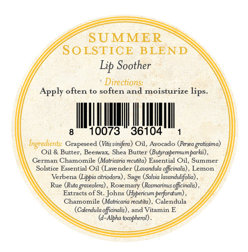 Fragrant and Aromatic our Summer Solstice Essential Oil is a decadent blend of Lavender, St. John’s Wort, Sunflower, Verbena, Rosemary, Calendula, Chamomile, Sage and Rue with gourmet oils and butters to pamper and hydrate lips. Creamy and rich, but never greasy this all-natural lip balm is instantly absorbed to restore and soften dry chapped lips.