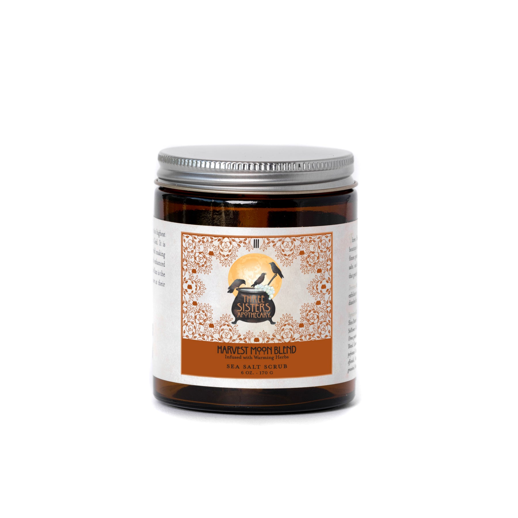 Three Sisters Apothecary Sea Salt Scrubs bring the calming, soothing benefits of a luxury spa experience home. The Harvest Moon is the full moon closest to the autumnal equinox, characterized by its orange color. While it is believed that the moon emits a subtle but distinctive feminine energy, it is during the full moon that it is at its most powerful and when lunar energy most interacts with intuition and intention. Our harvest moon bath salt soak pays homage to the power of the moon by combining natural salts and cleansing herbs of black pepper, ginger, turmeric, nutmeg, and allspice in a rich and warming blend. Submerge in a warming tub lightly scented with aromatic botanicals and revel in the splendor of the Harvest Moon.
